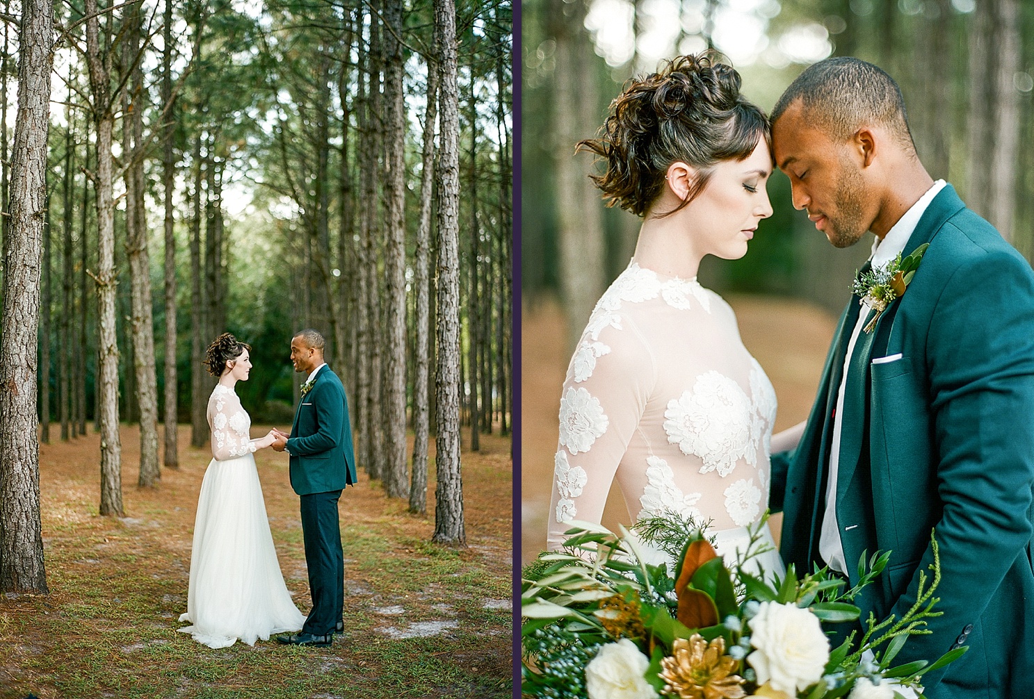 When conceptualizing this holiday shoot she really wanted to marry glamorous, edgy elements with rustic, woodsy ones and create a moody interpretation for a holiday wedding without feeling too over the top “Christmas.” She chose to keep the color palette simple, using only emerald green, gold, black and ivory accents, and create depth by bringing in various textures. The stunning backdrop of the pine tree forest provided the perfect juxtaposition to the glam elements and refined color palette.